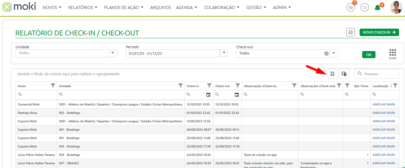 Para exportar seu relatório de Check-In/ Check-out, acesse o menu Relatórios >> Check-In/ Check-Out e no ícone de exportação destacado e exporte para Excel