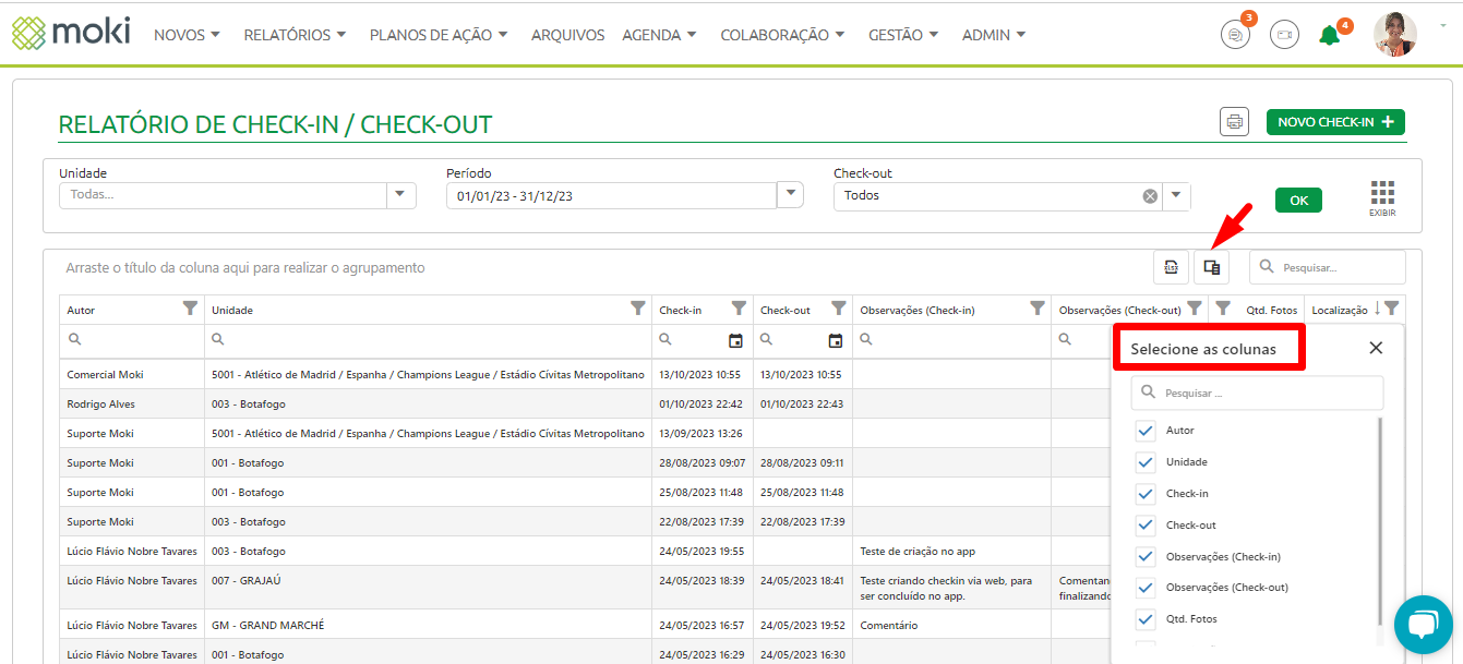 Para visualizar, seu relatório de Check-In/ Check-out, acesse o menu Relatórios >> Check-In/ Check-Out, selecione o período desejado e clique em OK, na tabela nossos usuários contam com uma caixa seletora de campos onde os mesmos podem ser incluídos ou retirados, montando a tabela de acordo com sua necessidade