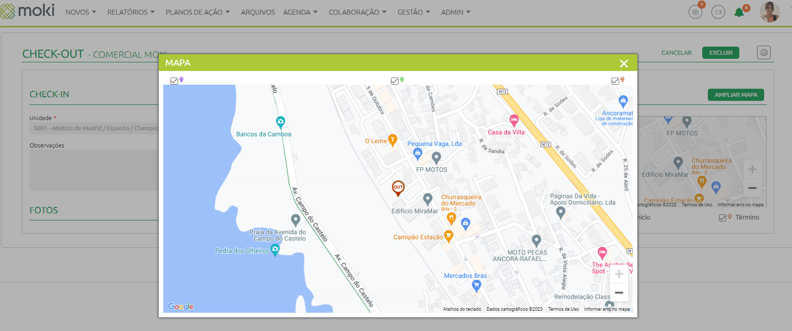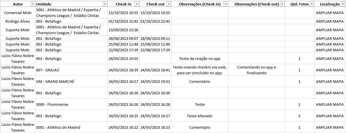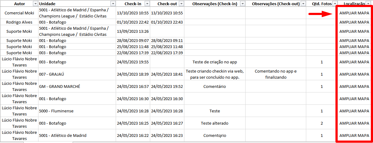 Outro destaque deste relatório em excel, é a coluna Localização, na informação "AMPLIAR MAPA" é possível clicar na frase e o mapa correspondente a este item será aberto diretamente na Moki.