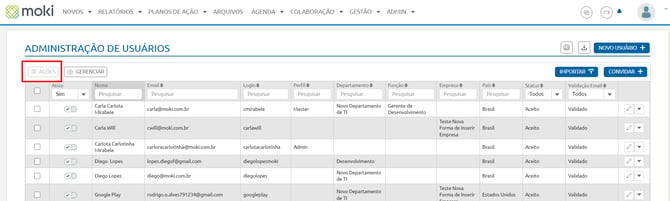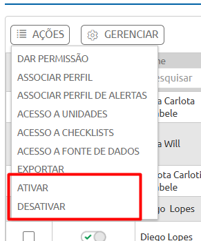 Iniciamos pela função Ações. Para utilizá-la, selecione um perfil de usuário clicando no quadrado localizado no canto esquerdo, destacado em vermelho. Após a seleção, a opção que antes estava inativa será habilitada para acesso. Ao clicar em Ações, serão apresentadas as seguintes opções: