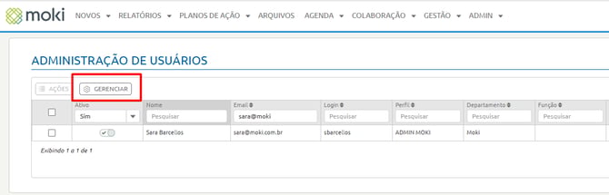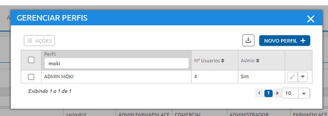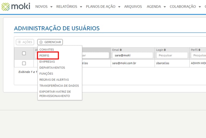 Ao clicar em Perfil, você terá acesso à opção Gerenciar Perfil. Nessa tela, é possível visualizar e administrar os perfis cadastrados no sistema.
