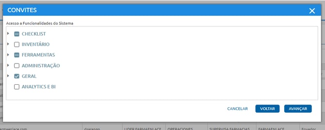 Nasta etapa, serão definidas as permissões do usuário. Nesse primeiro momento, você irá configurar o acesso às funcionalidades do sistema, ou seja, quais opções da plataforma o usuário poderá utilizar.