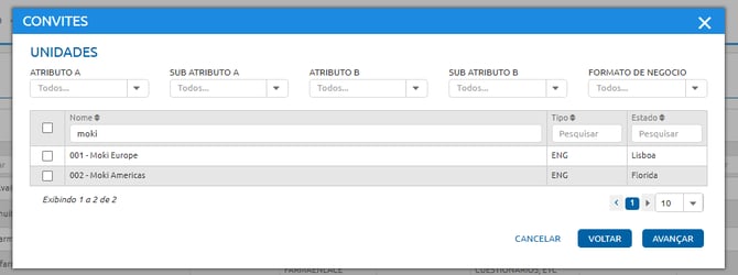Nesse momento será apresentada a etapa de liberação de unidades. Basta selecionar as unidades às quais o usuário deverá ter acesso e, após a seleção, clicar novamente em Avançar.