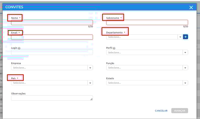 Nessa etapa, você deverá registrar os dados do usuário. É possível preencher todos os campos disponíveis ou apenas os campos obrigatórios, que estão sinalizados com asteriscos vermelhos na imagem. Esses campos são de preenchimento obrigatório para a criação do convite.