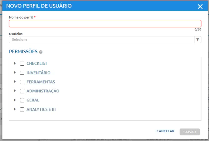 Ao selecionar Novo Perfil, você deverá informar o nome do perfil. Em seguida, será necessário configurar manualmente as permissões que os usuários associados a esse perfil terão dentro da plataforma.