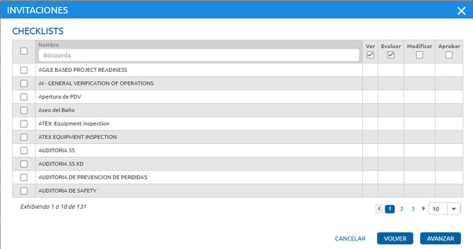 Aquí podrá habilitar los checklists para el usuario, permitiendo que visualice y ejecute los checklists asignados dentro del sistema. Junto a cada checklist estarán disponibles las opciones de visualizar, evaluar, editar y aprobar, que deben habilitarse según la necesidad del usuario.