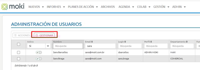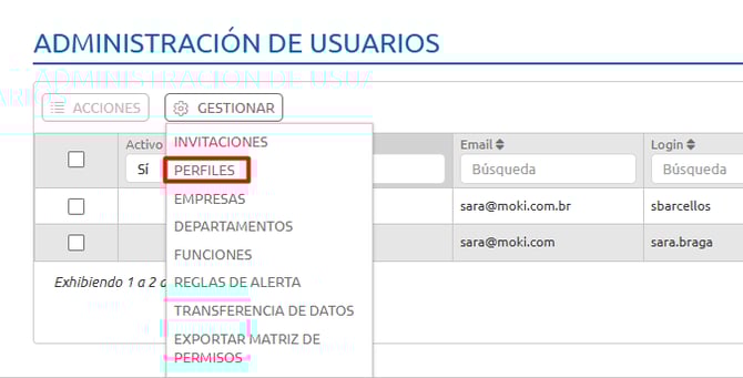 Al hacer clic en Perfil, tendrá acceso a la opción Gestionar Perfil. En esta pantalla, es posible visualizar y administrar los perfiles registrados en el sistema.
