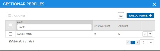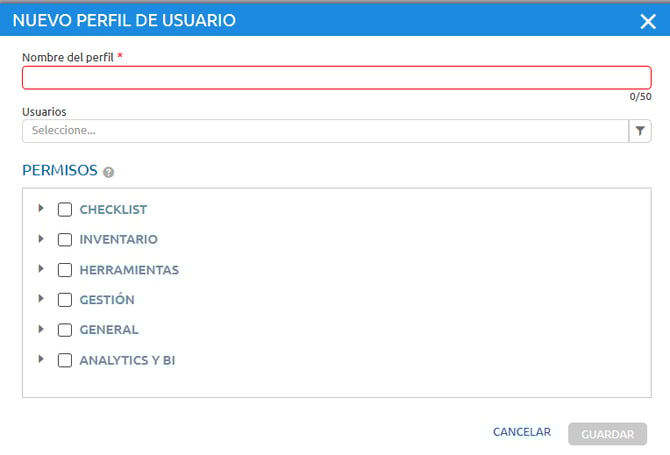 Al seleccionar Nuevo Perfil, deberá ingresar el nombre del perfil. Luego, será necesario configurar manualmente los permisos que tendrán los usuarios asociados a ese perfil dentro de la plataforma.