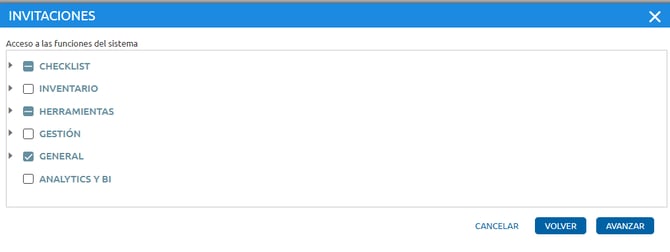 También es posible conceder acceso a inventarios y fuentes de datos, en caso de que el usuario necesite estos permisos. Para ello, después de configurar el acceso a checklists, haga clic en Avanzar, seleccione la opción Inventarios, avance nuevamente y luego seleccione la opción Fuentes de Datos.