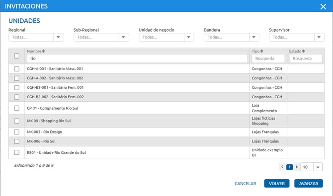 A continuación, se presentará la etapa de asignación de unidades. Solo debe seleccionar las unidades a las que el usuario tendrá acceso y, después de seleccionarlas, hacer clic nuevamente en Avanzar.