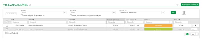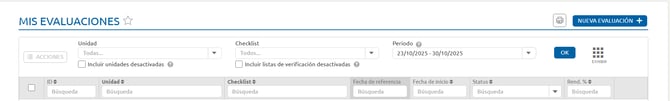 - Opciones para ordenar y buscar columnas por ID, Unidad, Lista de verificación, Fecha de referencia, Fecha de inicio, Estado y Utilización.