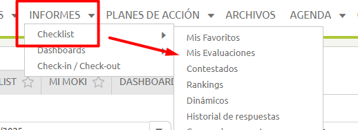 3. Para acceder a esta pantalla, en el Menú Principal haga clic en las siguientes opciones:- Informes > Checklist > Mis evaluaciones.