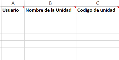 Antes de comenzar, debes asegurarte de que tu hoja esté correctamente formateada y organizada. Por lo general, la primera fila se utiliza para definir los campos, como usuario, nombre de la unidad, etc. Cada columna representa un campo específico. Las columnas en negritaindican que son campos obligatorios.